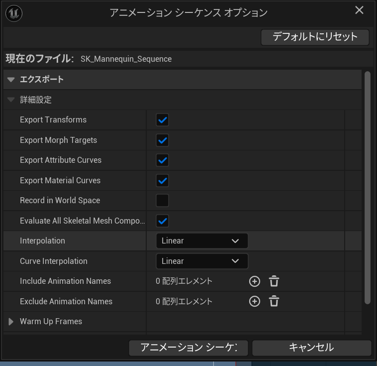 アニメーションシーケンスオプションは特に変更せずアニメーションシーケンスをエクスポートをクリックします。